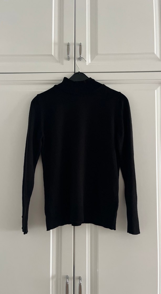 Siyah yün, boğazlı ve uzun kollu, sade ve şık görünüme sahip, günlük kullanıma uygun kadın kazak.