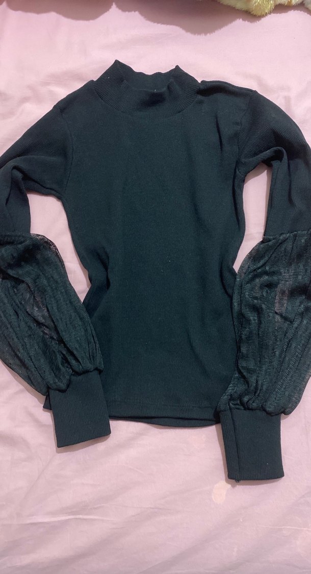 Siyah, boğazlı ve uzun, hafif transparan triko kollu, vücuda oturan kadın bluzudur. Normal boyda ve günlük kullanıma uygun gotik tarzda.