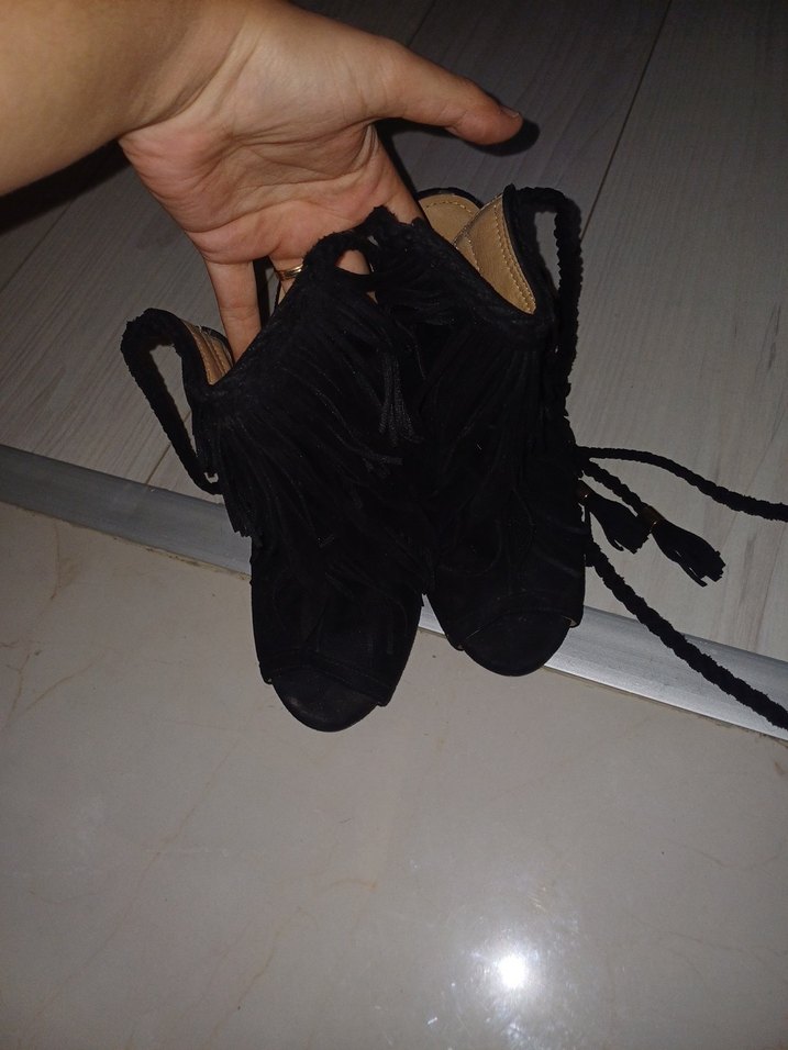 Siyah bohem tarzda bağcıklı ayakkabı, koyu renk ve detaylı dokuya sahip. Farklı bir görünüm için ideal. 1 kez kullandım