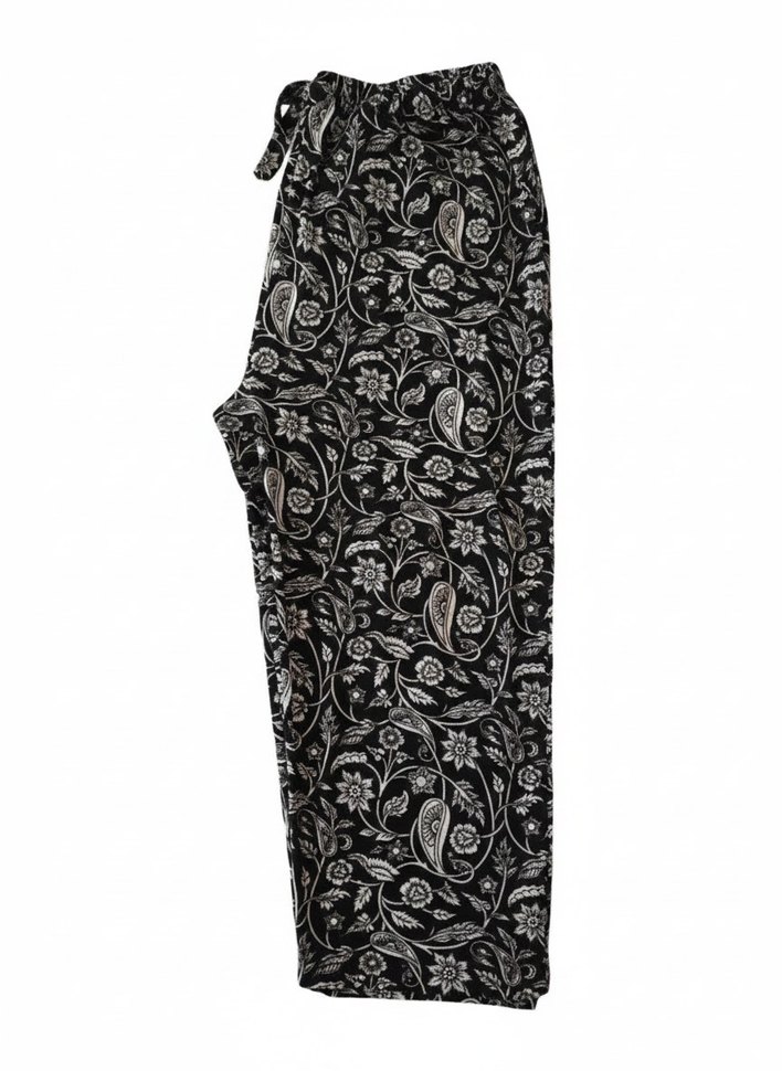 Bol kesim, uzun boy kadın eşofman, bohem çiçek desenli, cepli ipeksi kumaş ve kemerli. Günlük kullanım için koyu siyah tonunda. Boy: 87cm Bel: 38cm