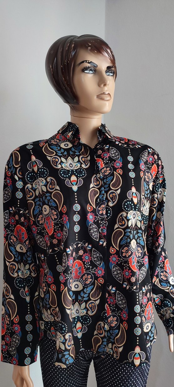 Bu bol kesim kadın gömlek, yakalı ve düğmeli ön kısmıyla koyu renkli sentetik kumaş üzerine canlı bohem desenlerle süslenmiştir.