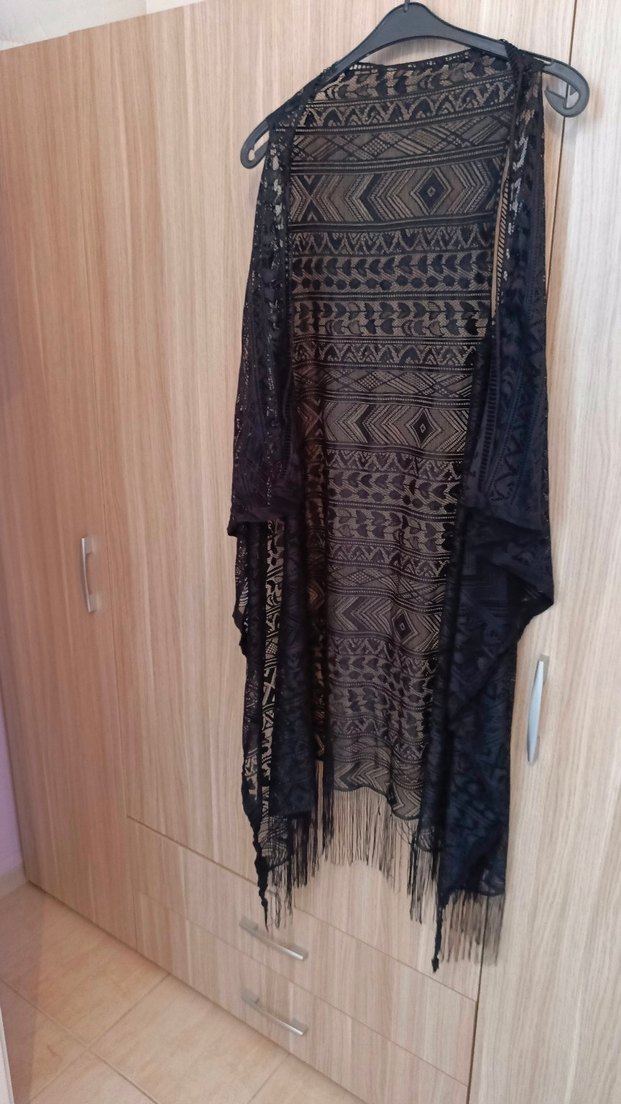 Siyah renkli dökümlü bohem desenli pareo Uçlarında püsküller bulunur, retro bir hava katar.