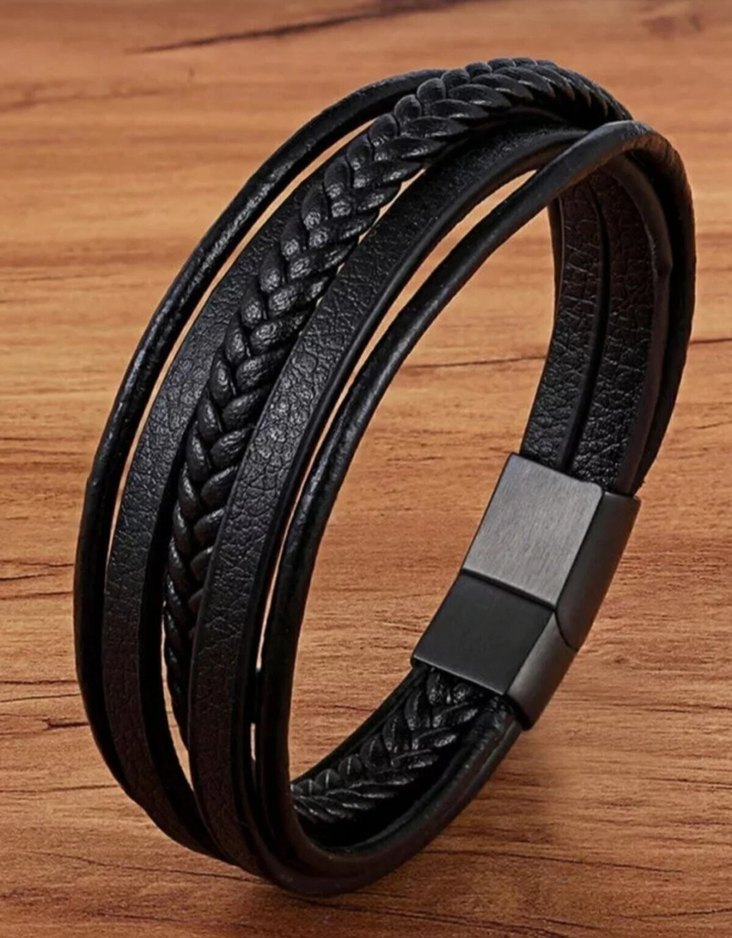 5li hakiki deri siyah erkek bileklik, örgülü ve düz deri bantlardan oluşur, çelik kapatma ile sabitlenmiştir. Minimalist ve bohem tarzda.