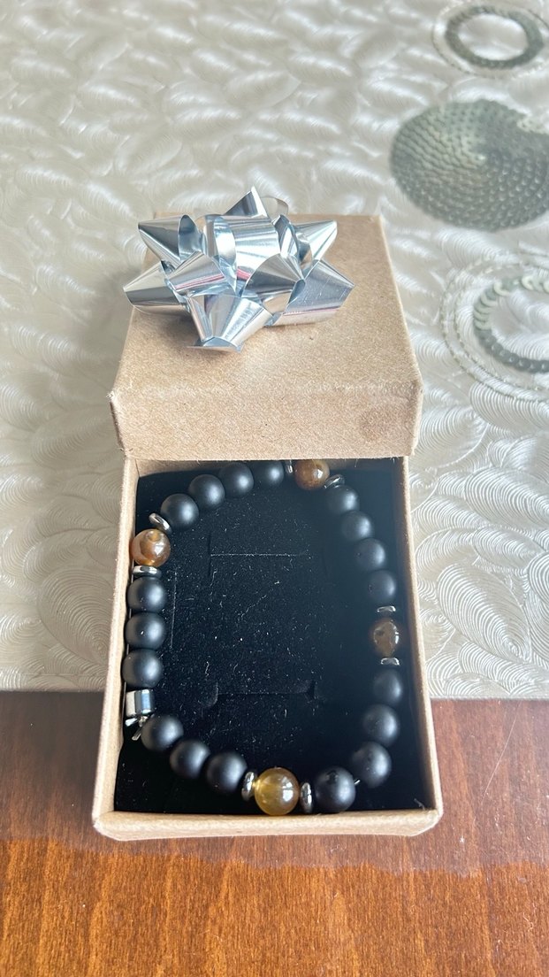 Mat siyah boncuklar ve parlak kahverengi taşlarla bohem tarzda erkek bileklik. Gümüş kurdeleli hediye kutusunda sunulur. Sıfır ürün hediye için iyi bir seçim esnek ipten yapıldığı için her bileğe uygun sevdiğinize değer verdiğinize güzel bir hediye