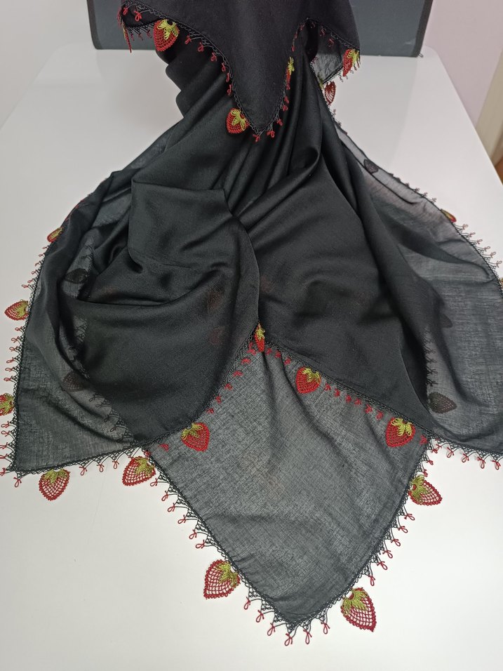 Siyah renkli, uçları çilek işlemeli, bohem tarzda kadın esarbi. Yumuşak dokulu tekstil malzemeden üretilmiştir.