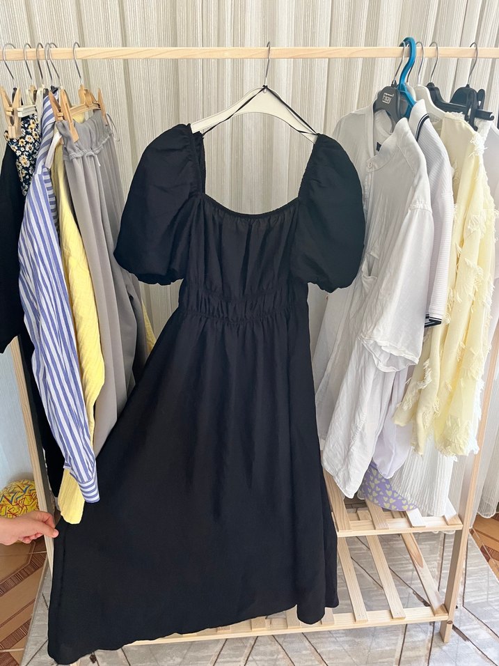 Siyah pamuklu midi elbise, geniş kesim, tekne yaka ve kısa drapeli kollara sahip, bohem ve Paris tarzını yansıtır.