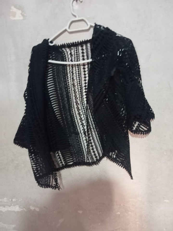 Siyah renkte, bohem tarzda, kısa ve askılı kollu, V yakalı, bol kesim örgü kadın hırkasıdır. Günlük kullanıma uygundur.