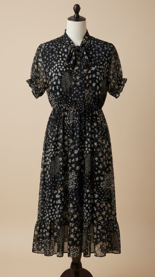 Siyah uzun elbise, yüksek yakalı ve bağcıklı, kısa volanlı kollu, bol kesimli. Günlük kullanım için uygun, hafif çiçek desenli. sipariş ederken elektonik aletse çalışır durumda olduğunu , giyim ise şeffaf gösterilen bir şekilde videosunu atabilirim.