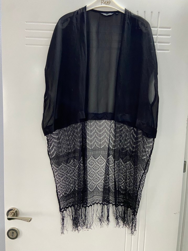 Hafif sentetik kumaştan yapılmış, dökümlü siyah kadın pereo bohem tarzda dantel desenleri ve püskül detaylarıyla.