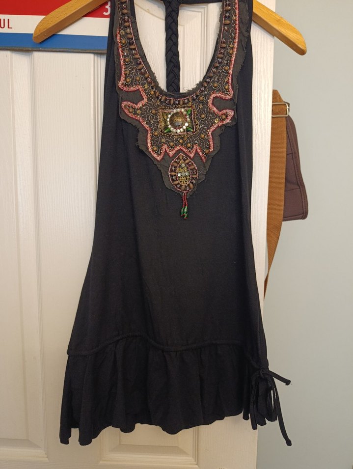 Siyah bohem 38 beden esnek kumaş tunik/elbise. Boncuk işlemeli, penye kumaş. arka kısmı yarım full örgüdür. vintage bir parça.