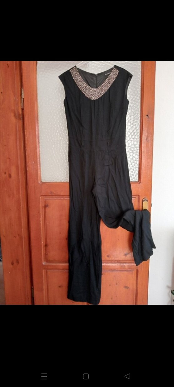 Siyah, kolsuz, yüksek yakalı ve dökümlü kesime sahip bu uzun tulum, sentetik kumaştan üretilmiştir. Trendy günlük kullanım için uygundur.✨ Kullanıldı.. lc Waikiki 36 beden yakasında boncuk detaylı siyah tulum.. kemeri yok ve ütüye ihtiyacı var bilerek ve kabul ederek alınız, iki kol altı arası: 45 cm. Bel: 40 cm.. ihtiyaç fazlası fotoğraflarda gördüğünüz gibidir..
