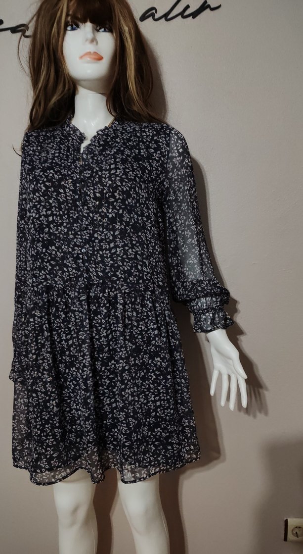Siyah, uzun kollu, düğmeli midi elbise, bohem tarzda yüksek yakalı ve bol kesimdir. Günlük kullanıma uygundur.