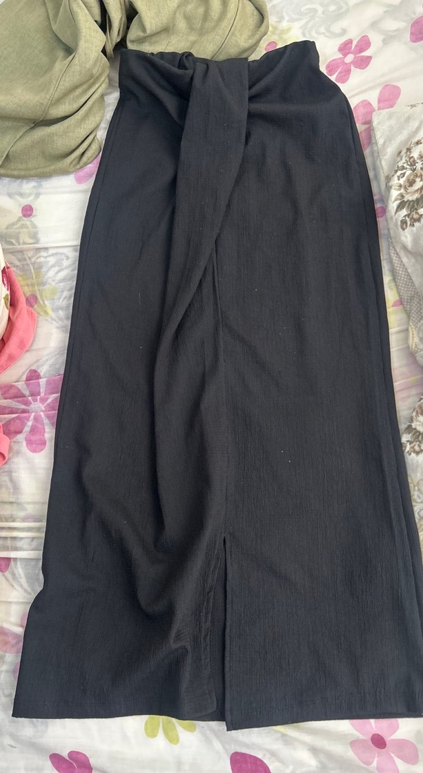 Yumuşak sentetik kumaştan, salaş kesim ve drapeli tasarıma sahip siyah uzun etek. Bohem tarzını yansıtır, günlük kullanım için uygundur.