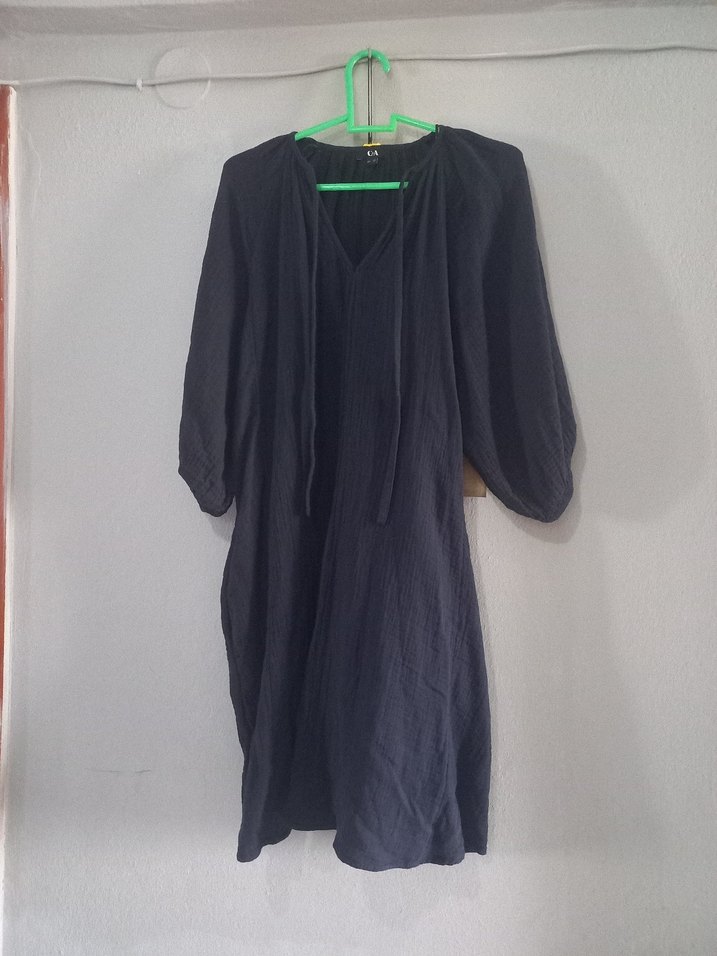 Siyah renkli, bol kesim ve drapeli tasarıma sahip . V yakalı, uzun kollu ve midi boyda, rahat keten kumaştan üretilmiştir.