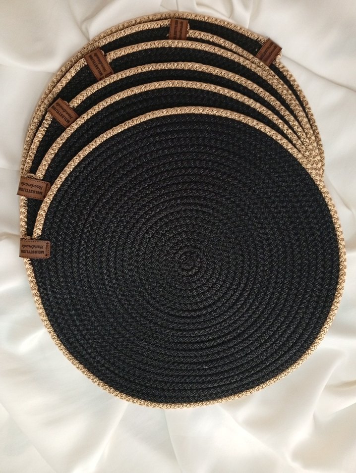 Bohem tarzda, dokuma dokusuna ve doğal kenar detaylarına sahip siyah yuvarlak Amerikan servis seti. ️33 cm 6 adet supla.