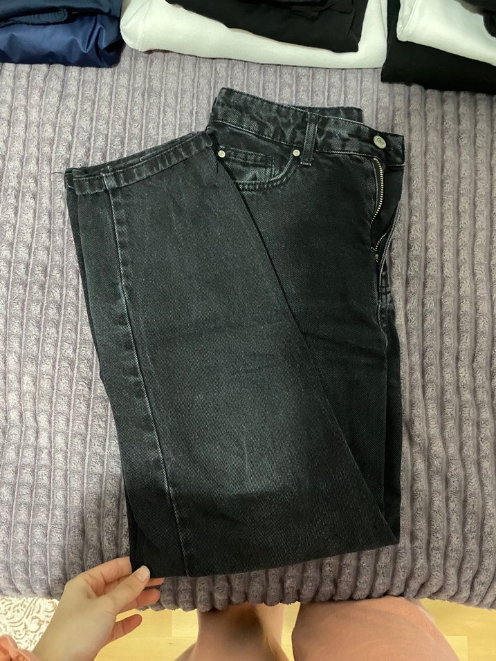 Siyah denim kumaştan, bol kesim ve midi boyda, günlük sokak stiline uygun rahat ve şık kadın kot pantolon.