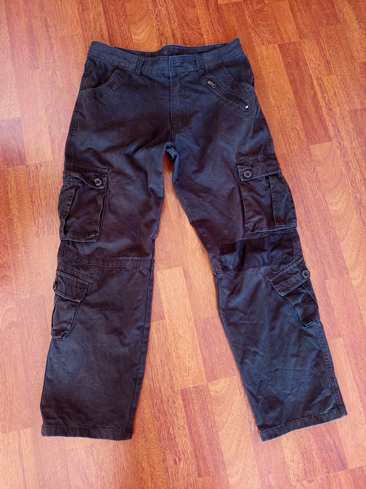 Siyah bol kesim, kot kumaştan erkek pantolonu, cep detaylı, sokak stiline uygun rahat bir model. Bir iki leke var, bir düğmesi eksik ve yama yapılmıştır.