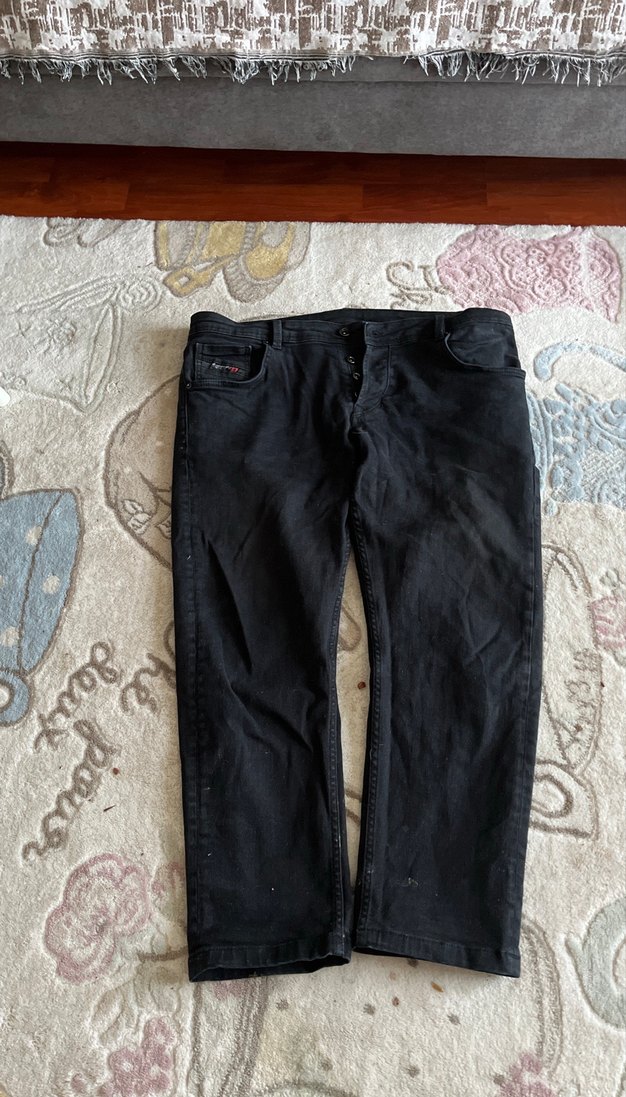 Siyah renkte, bol kesim ve kemerli erkek kot pantolon. Günlük kullanıma uygun, midi boyda ve rahat bir sokak stili sunar.