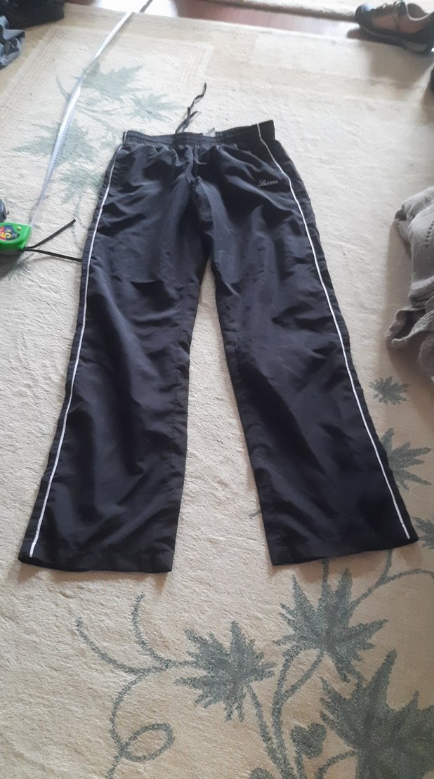 Siyah renkli, bol kesim ve kemerli kadın alt esofman Rahat sentetik kumaştan, yan çizgilive sokak stiline uygun.