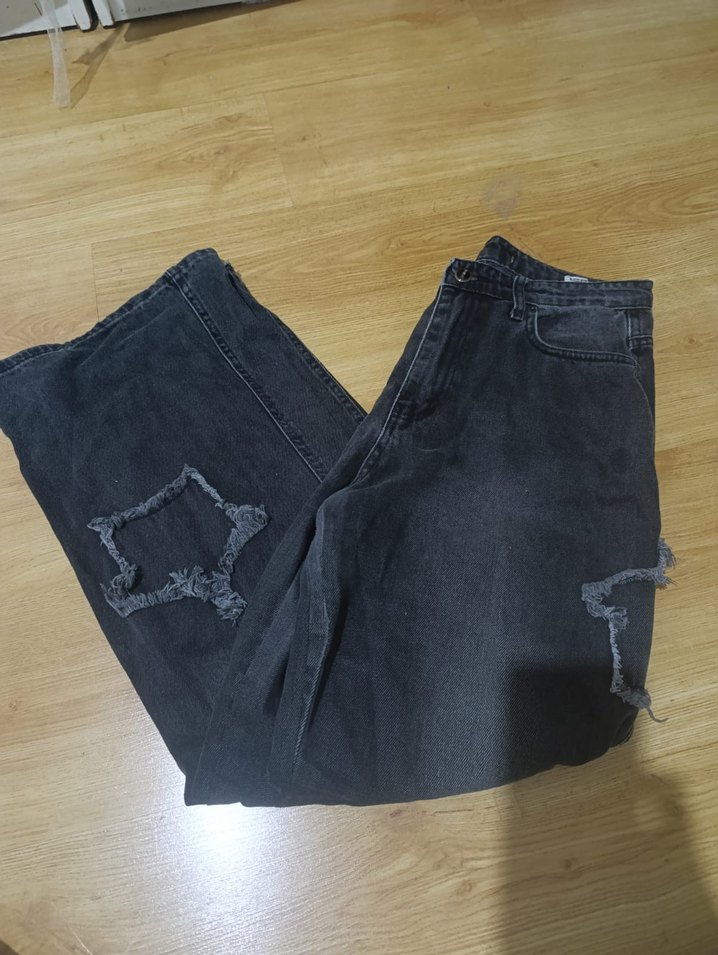 Siyah renkli, bol kesim denim pantolon, yırtık detaylı ve kemer tokalı, günlük sokak stili için uygun.