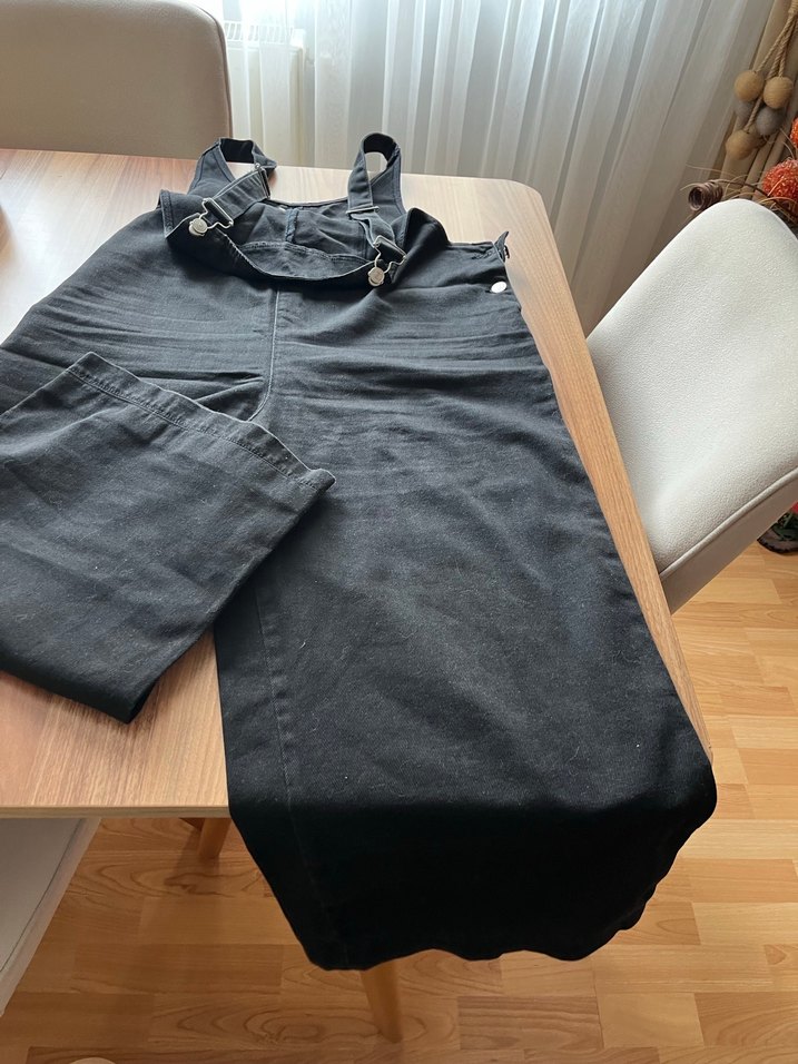 Siyah renkli, bol kesim ve tokalı askılara sahip kadın denim tulum. Midi boyda ve günlük kullanıma uygun normcore tarzda.