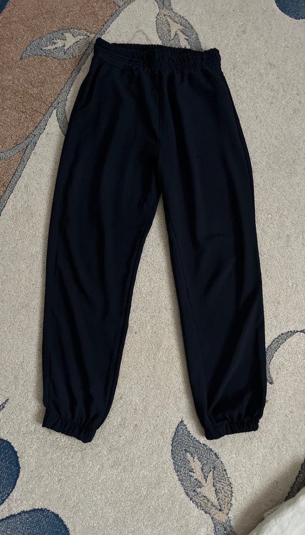Siyah, bol kesim, midi boy kadın eşofman altı. Yumuşak sentetik kumaştan, rahat ve şık günlük kullanım için uygun.
