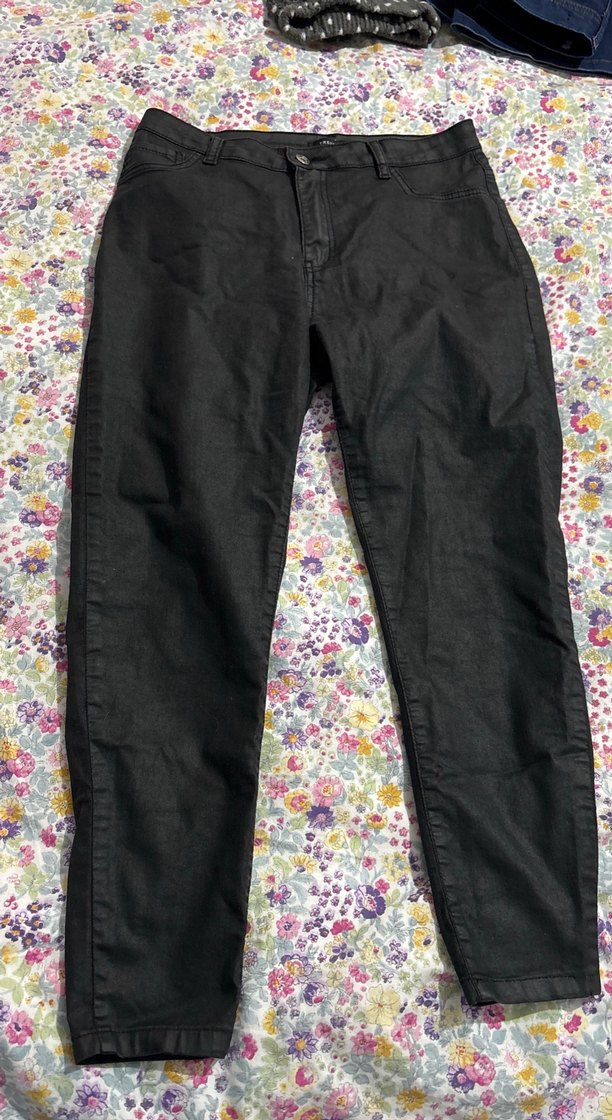Bol kesim siyah denim kot pantolon, kemer detaylı. Midi boy ve günlük kullanım için uygun rahat bir sokak stili sunar.