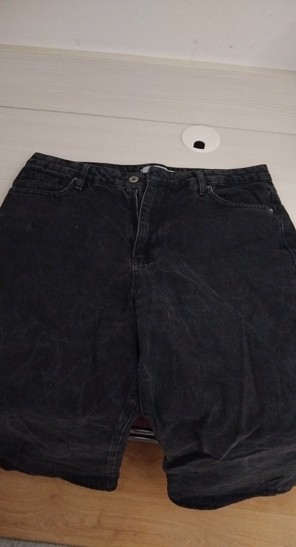 Siyah kot kumaştan, midi boy ve bol kesim kadın kot pantolon. Günlük sokak stili için rahat ve şık bir tercih.