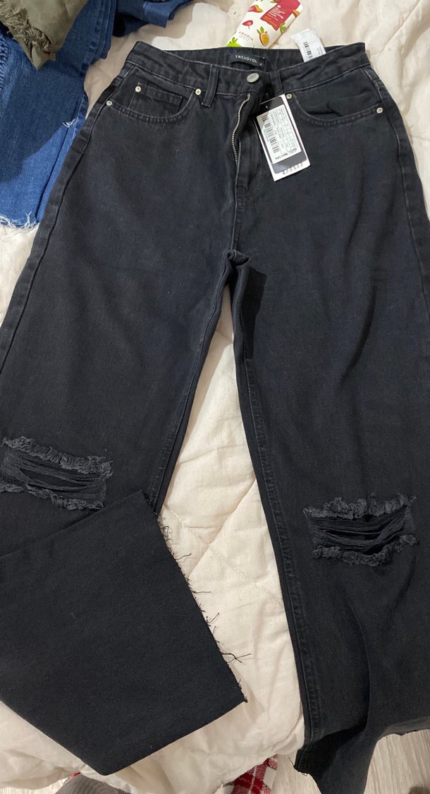 Siyah renkli, bol kesim ve kemer detaylı kot pantolon, yırtık dizleriyle günlük sokak stili için uygundur.