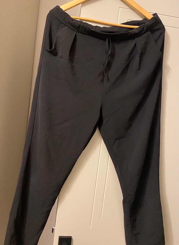 Siyah kumaştan, bol kesim ve boyda, kemerli kadın pantolon. Günlük rahat ve şık kullanım için uygundur. Lastiğigevşemiş lastik takmak gerekli