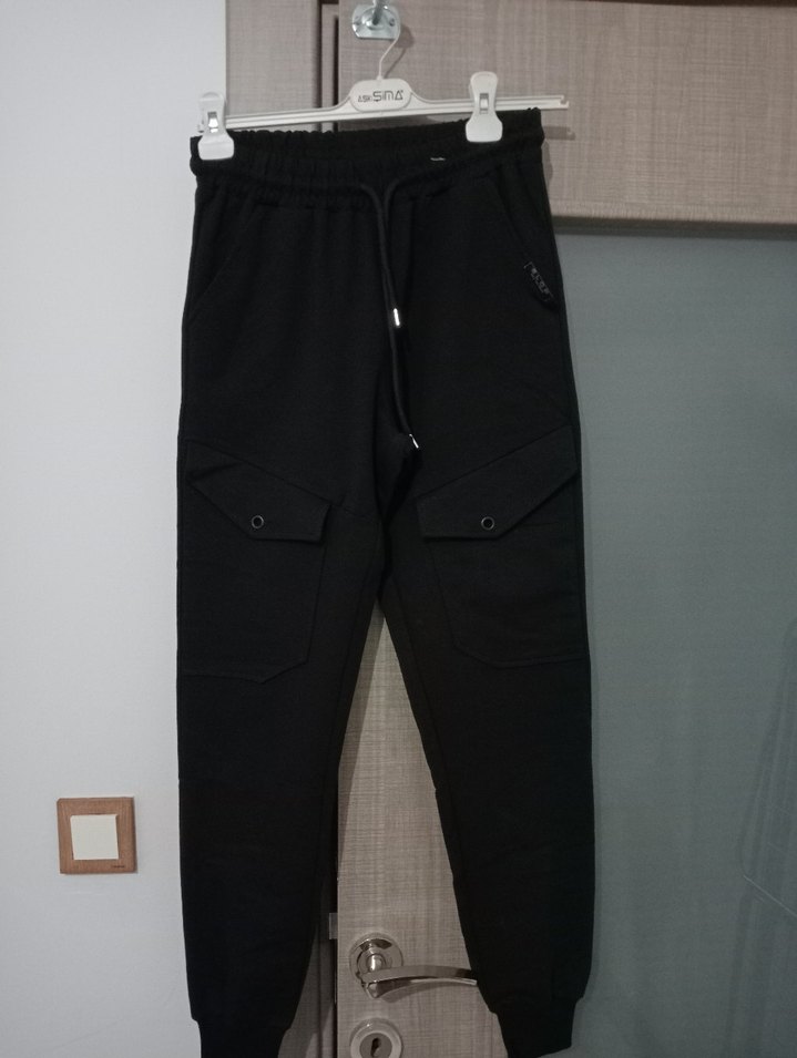 Siyah, bol kesim, kemerli, normal boy erkek eşofman altı. Yumuşak ve sıcak kumaştan, dış mekan kullanımı için uygun.