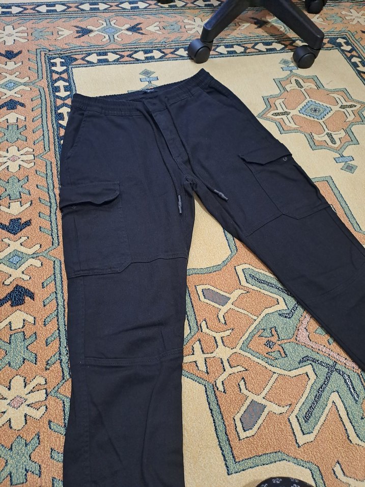 Siyah bol kesim kemerli kargo cepli erkek kot pantolon, normal boyda, çoklu ceplidir. günlük kullanım için uygundur. bir kez kullanıldı