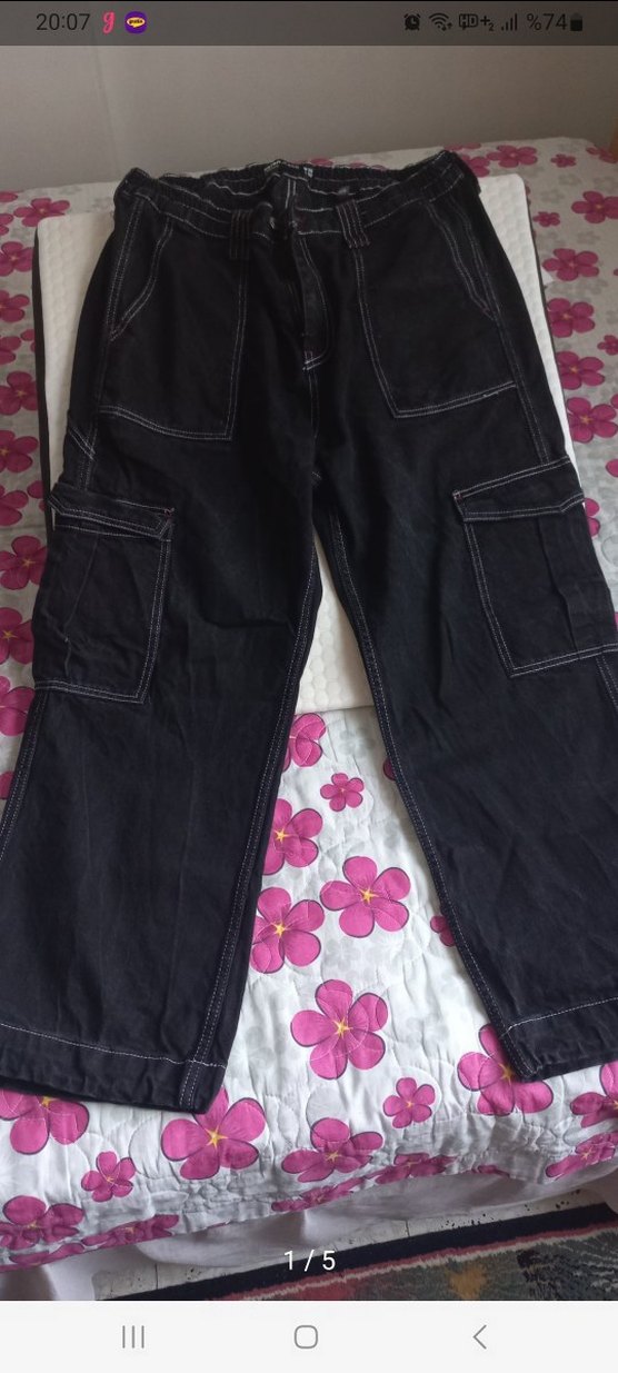 Siyah renkte, bol kesim ve kemerli kot pantolon, çoklu ceplerle günlük sokak stili için uygun. bel 53,boy 102, bel lastikli