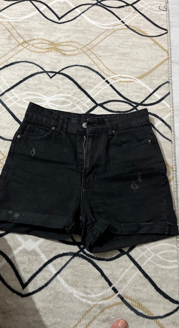 Siyah bol kesim denim şort, kemerli detaylı ve kısa boylu, hafif yıpranmış dokunuşlarla grunge punk tarzını yansıtıyor. Günlük kullanım için uygun.
