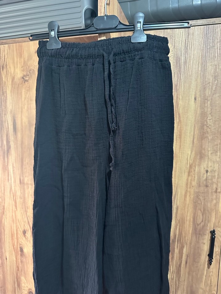 Siyah keten kumaştan, bol kesim ve uzun boylu, bohem tarzda rahat kadın pantolonu. Günlük kullanıma uygundur.