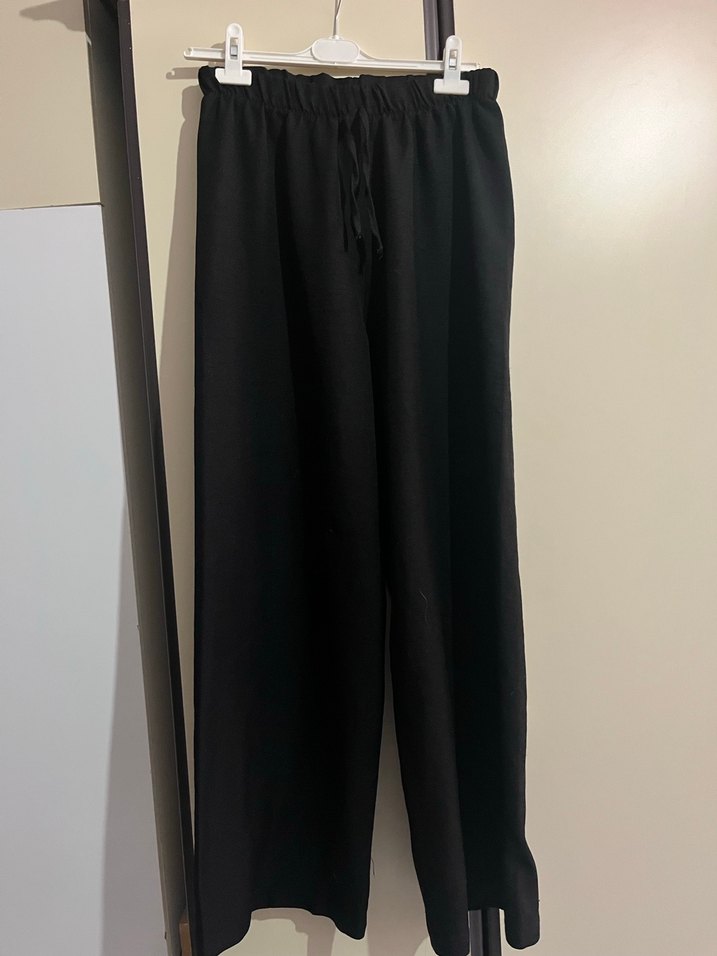 Uzun siyah keten pantolon, bol kesim, lastikli bel ve bağcıklı. Minimalist ve rahat sokak stiline uygun.