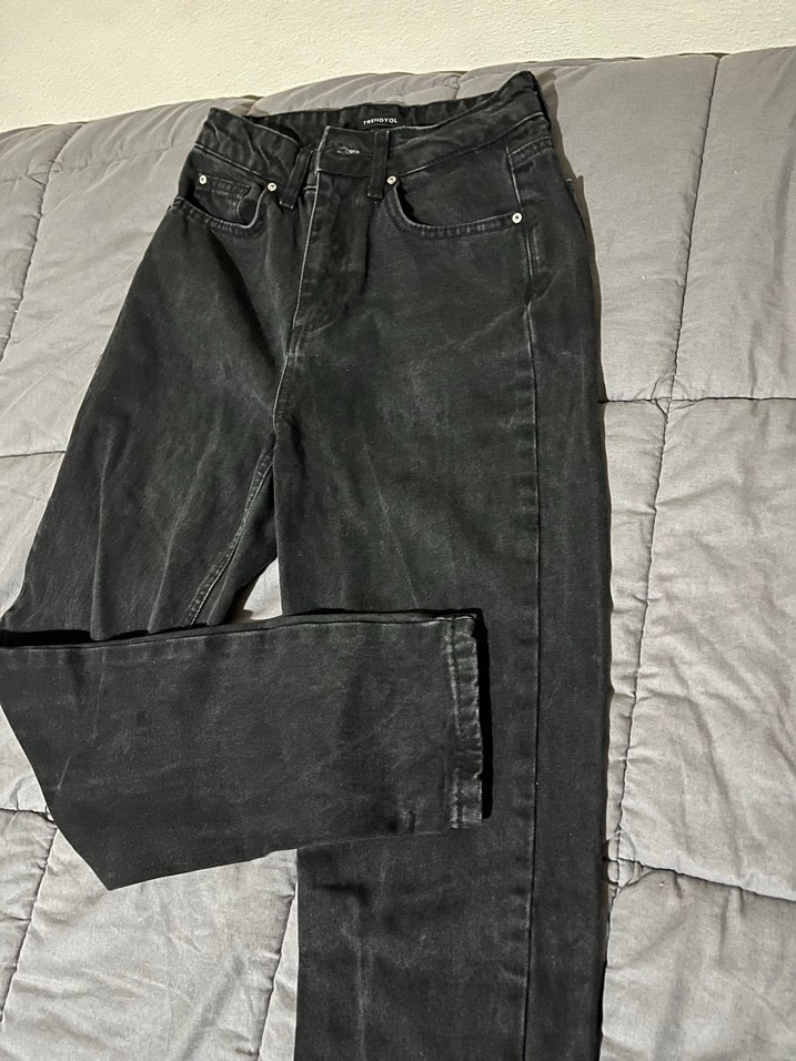 Düğmeli kapanışa sahip siyah bol kesim denim pantolon,. Günlük rahat kullanım için uygundur