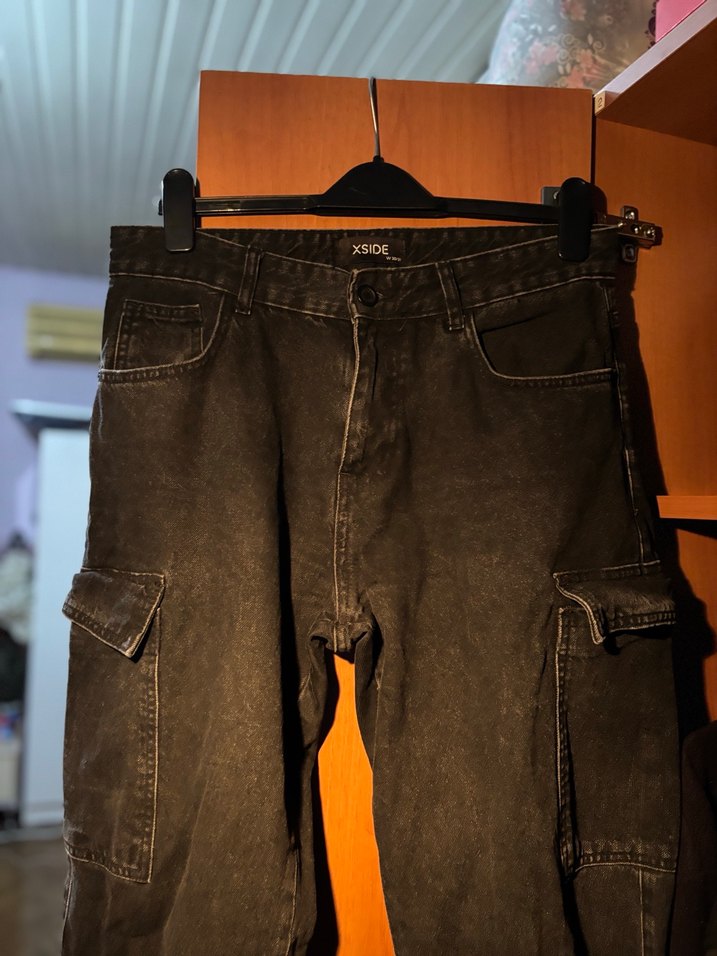 Siyah bol kesim kot pantolon, kemerli bel ve cep detaylarıyla günlük rahat sokak stili için uygun.