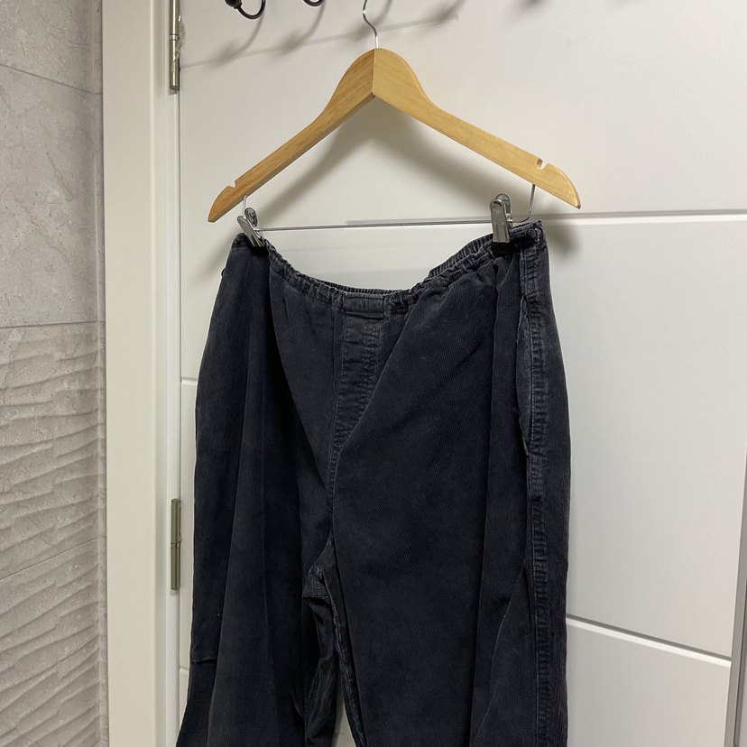Bol kesim siyah beli lastikli kadife pantolon.Ayarlanabilir paçalar içerir, rahat sokak stili için uygundur.