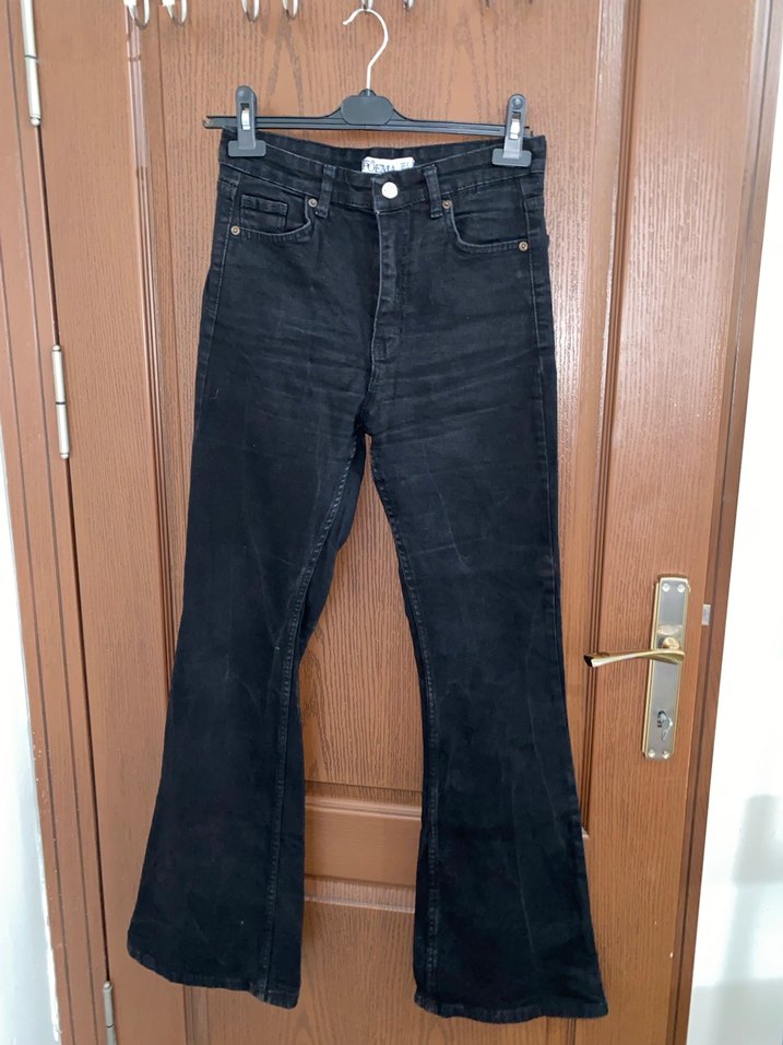 Bol kesim, tokalı siyah kot pantolon. Midi boy ve normcore tarzıyla günlük kullanıma uygun. Trendy casual görünüm için ideal.