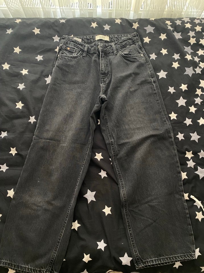 Siyah renk, bol kesim midi uzunlukta, tokalı detaylı denim kadın kot. Günlük kullanıma uygun, rahat ve trend sokak stili sunar.