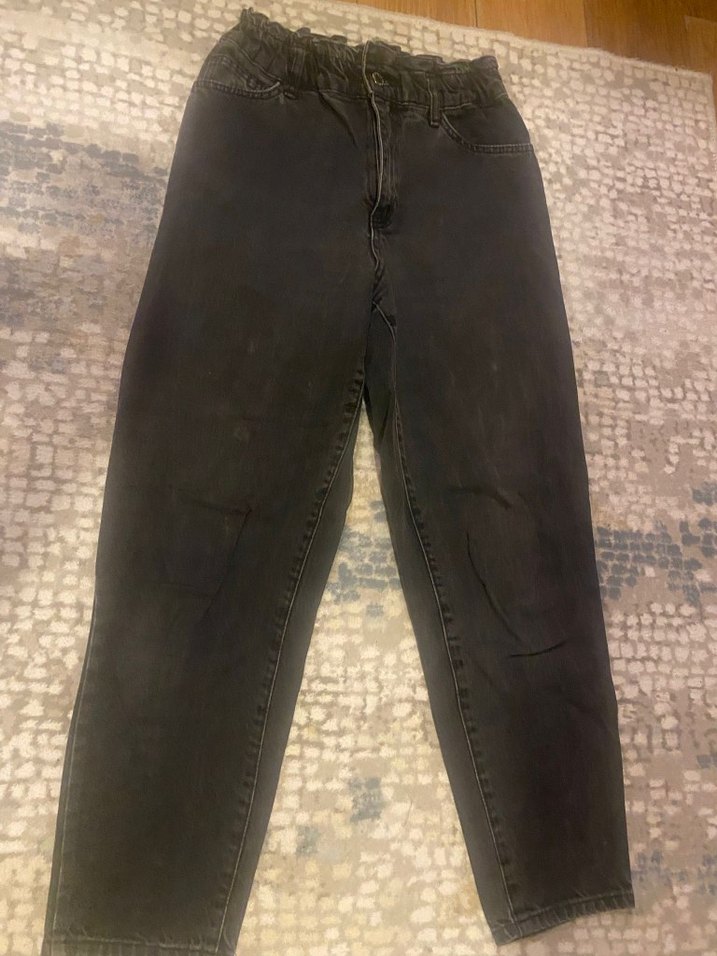 Siyah bol kesim midi kot pantolon, kemerli ve gündelik rahat sokak stili için uygun. Trendy ve konforlu görünüme sahip.