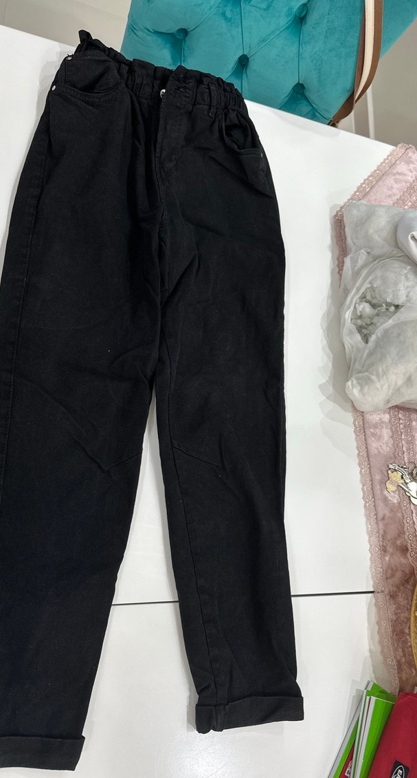 Siyah renkte, bol kesim ve midi boyda kadın kot pantolon. Minimalist ve rahat bir günlük stil sunar.
