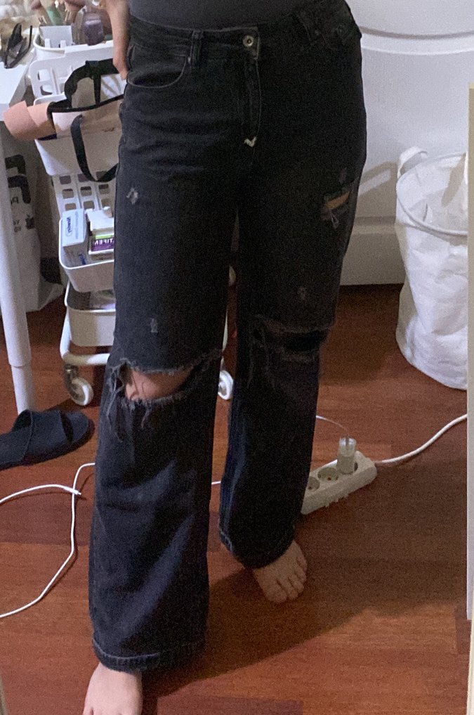 Siyah kot kumaştan yapılmış, bol kesim ve midi boyda, tokalı detaylara sahip günlük sokak modası için uygun kadın kot pantolonudur.