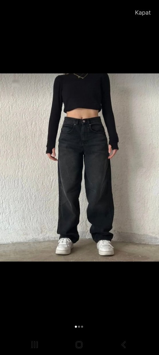 Bol kesim, midi boy siyah denim kot pantolon, günlük rahatlık ve zahmetsiz şıklık sunar. Trend sokak stiline uygundur.