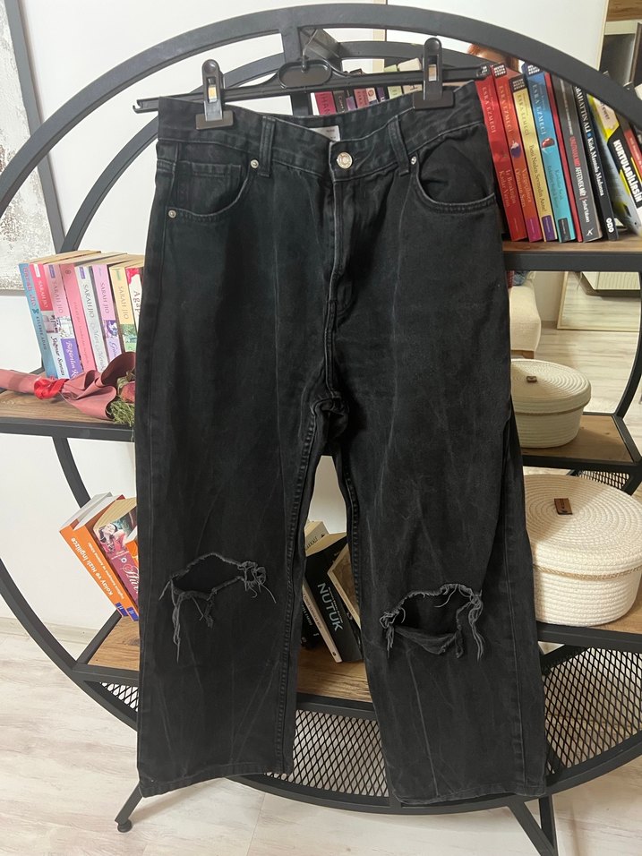 Siyah bol kesim, midi boy kot pantolon. Yırtık diz detaylı, sokak stili için uygun, günlük kullanımda rahatlık sağlar.