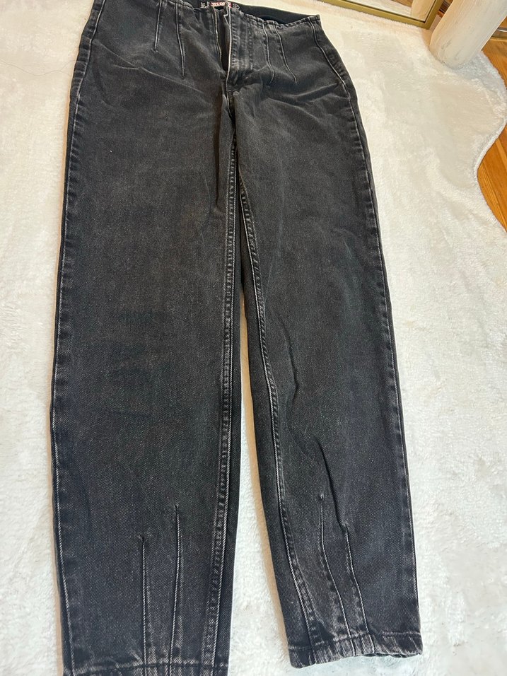Siyah renkte, bol kesim ve midi boy kot pantolon. Desensiz tasarımı ve rahat kesimiyle günlük sokak stiline uygundur.