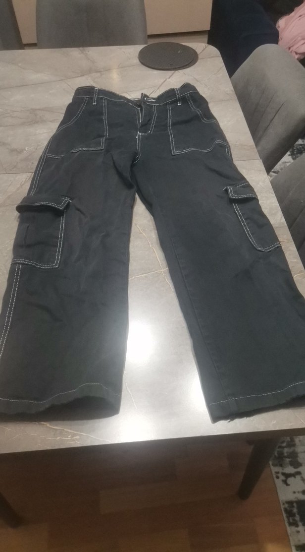 Siyah kot kumaştan yapılmış, bol kesim midi pantolon. Kemer detaylı ve günlük kullanım için uygun, rahat bir sokak stili sunar.
