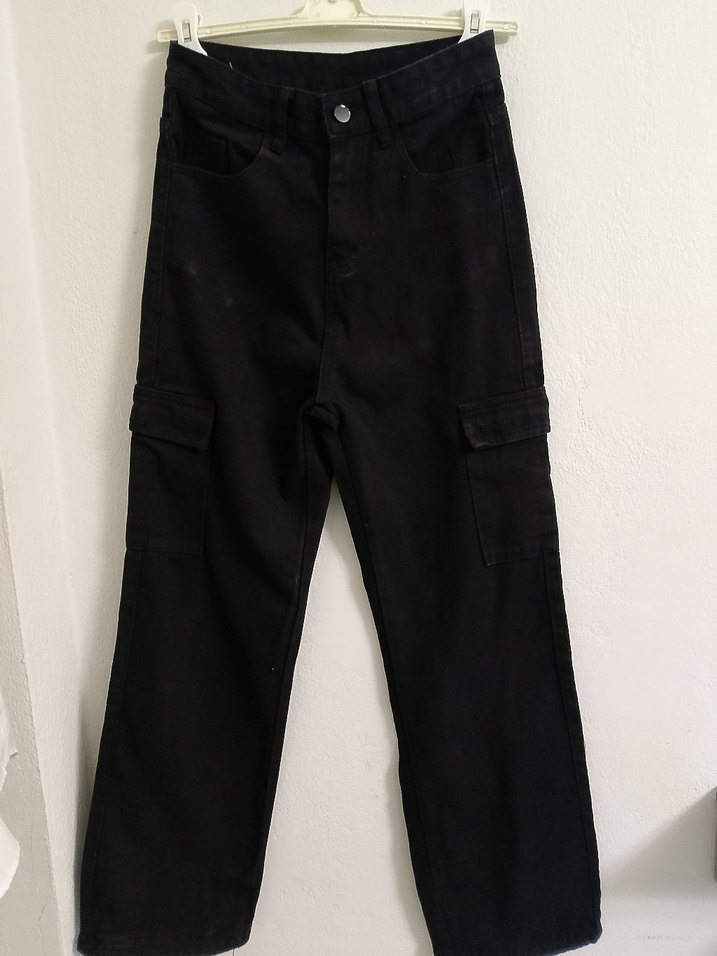 Siyah, bol kesim midi kot pantolon. Sokak stilinde, günlük kullanıma uygun, desen içermeyen şık ve rahat bir model.
