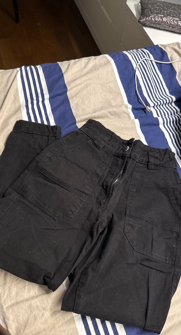 Siyah bol kesim kot pantolon, koyu denim kumaş ve desensiz tasarımla rahat ve şık bir görünüm sunar.